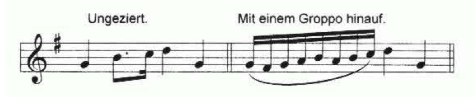 Previous songmasters made a great deal out of the embellishment which they called groppo. According to my German translation, this word means grapelike cluster, and l simply cannot understand how it is possible that this word, groppo, should mean roller or ball, even though Printz, Walther, and many others define it as such in their books. It is undoubtedly derived from grappo, which means a grape, even in French and English. It denotes all those things, both literally and figuratively, which are referred to as clusters, both in Lower Saxony and England (as well as in old High German), namely many small berries or other items which are clustered together just as the notes in this Manier, which are all bound together. These groppi can be applied either periodically as simple coincidental embellishments or can be used to substantially structure the melody, forming entire runs. These runs can contribute in no small part to the musical expression, should the expression of the desired affection permit such turning and revolving.3