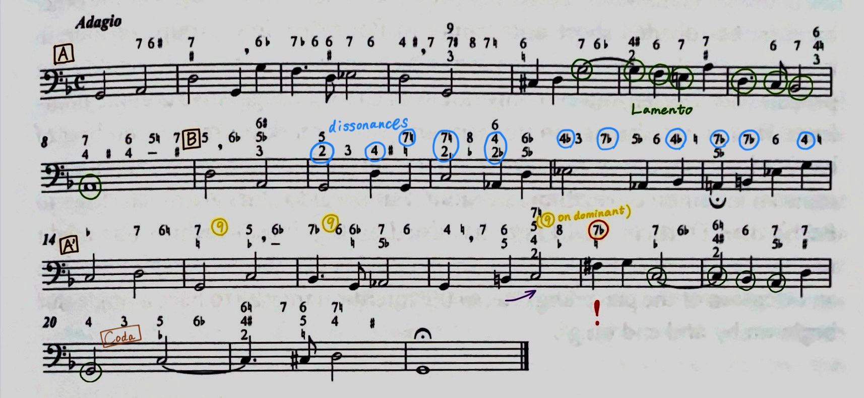 It is in a three parts, A-B-A' with a coda which Prof. Terakado says, serves as a role model for rhetorical form. The A part conveys a lamento, particularly evident in bars 7 and 8. The B part raises an objection to the A part, and then comes back to A' part, a variation of A, now with even stronger dissonances. This part aligns with the rhetorical term named confutatio—the refutation of opposing arguments.