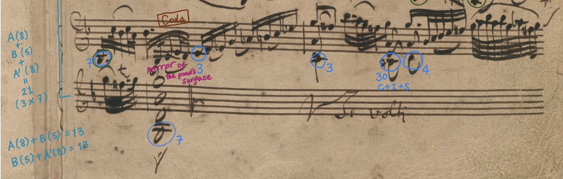 In the Coda, Orpheus encounters the mirrored surface of the pond, mourning the cruel truth of his destiny. Likewise, a heartbroken and devastated Johann Sebastian Bach grieves for his own loss, searching for no one but Maria Barbara. Though written in 4/4, the Adagio contains an overwhelming depth of emotion, rising and falling within each tactus. The penultimate bar overflows with feeling, culminating in the final G minor chord, which brings the Adagio to a close and leads into the Fuga that follows.