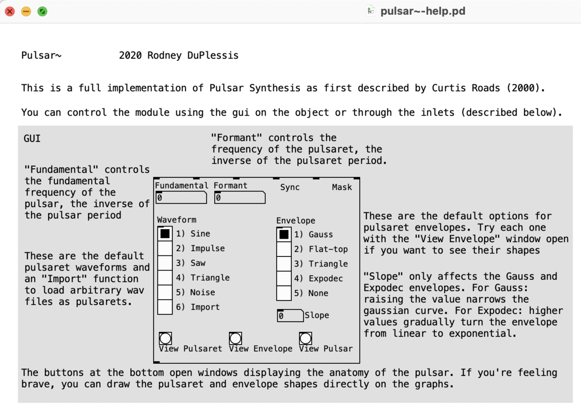 In designing sound behaviours, I took into account the large amount of parameters that we wanted to sonify, and the fact that often molecular quantities are understood in terms of particles. I therefore adopted a form of synthesis called pulsar synthesis. Pulsar synthesis is often referred to as ‘nonstandard’ synthesis due to its degree of difference from forms of synthesis traditionally associated with analogue synthesis (Roads, 2021b). It is endemically digital in its approach to synthesizing sound in that it applies a shaping envelope to a single duty cycle of an already shaped waveform, resulting in a modulation in the microsound domain (Roads, 2021a).