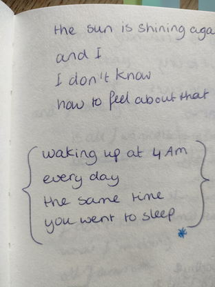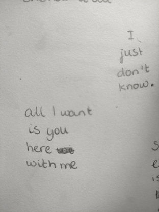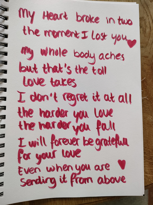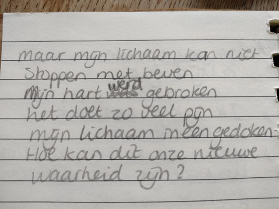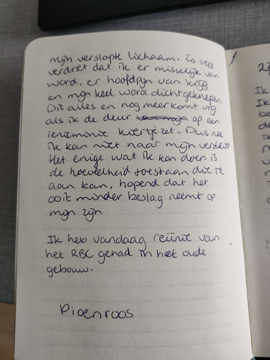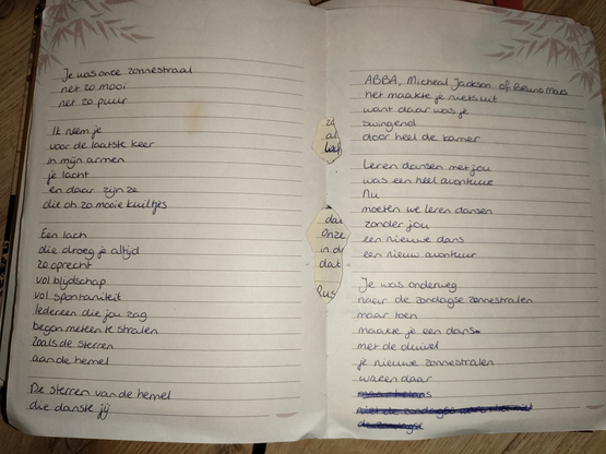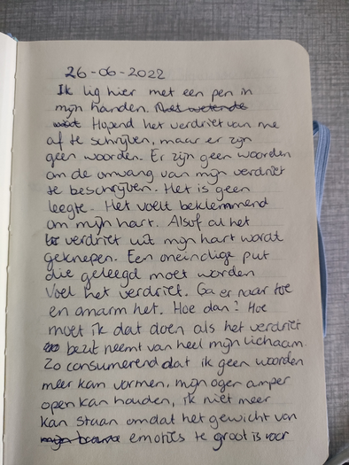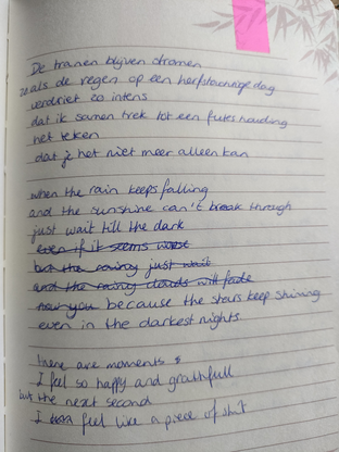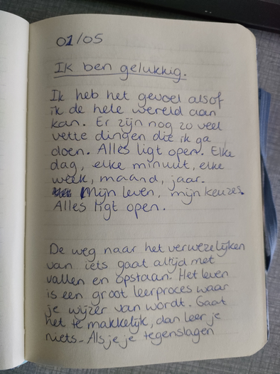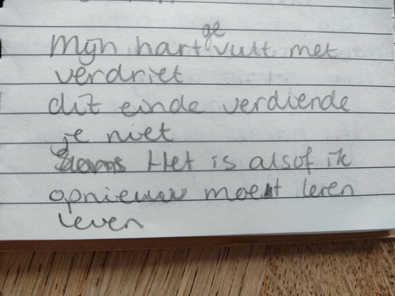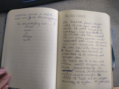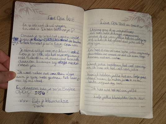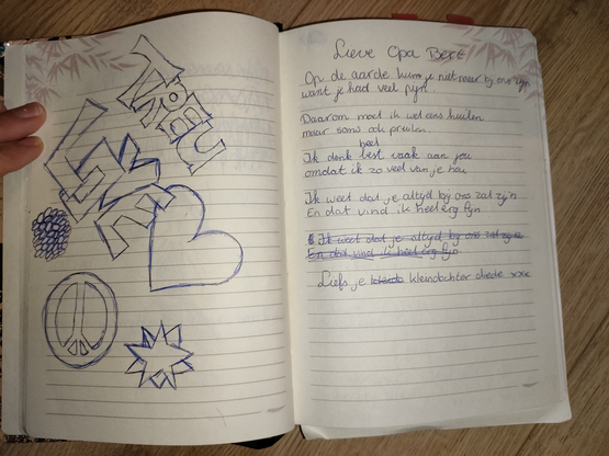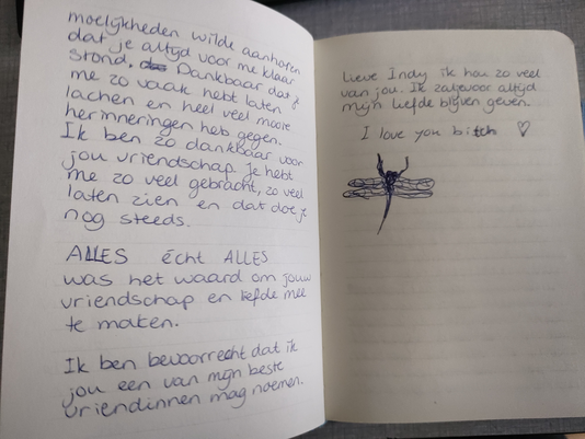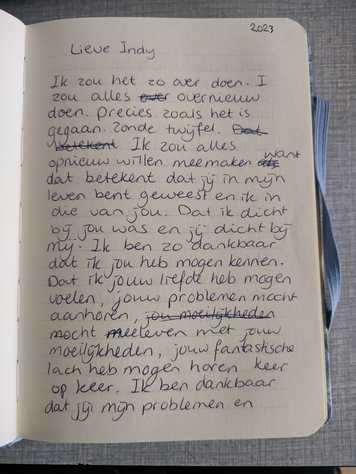 Schrijven is mijn uitlaatklep. Als ik niet weet wat ik met mijn gevoel moet, omdat het zo intens is, dan ga ik gedichten schrijven. Als ik opa en oma of Indy heel erg mis of ik wil ze iets vertellen, dan ga ik brieven schrijven. Zit ik in de knoop met mezelf, zowel mijn gedachtes of gevoelens, dan ga ik mijn hoofd leegschrijven. Ik schrijf letterlijk alles van me af. Het heeft een rustgeven effect.