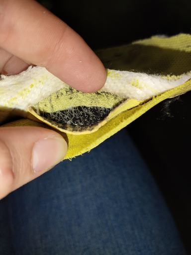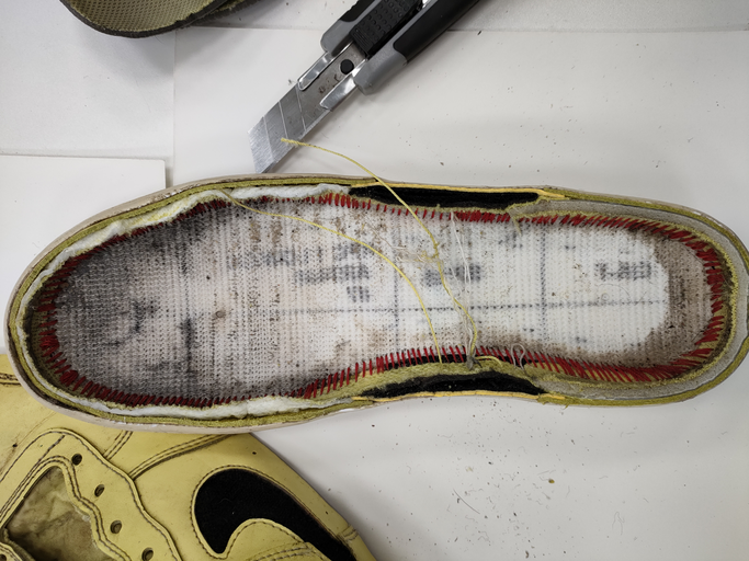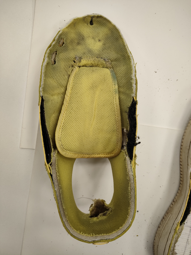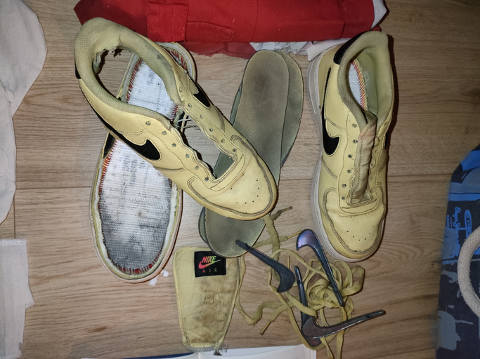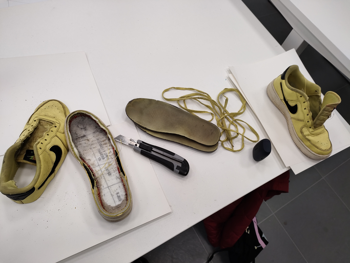 Toen ik mijn schoenen uit elkaar ging halen viel het me eerst op hoeveel vuil eruit viel, waarvan ik niet wist dat het er in zat. Vervolgens ontdekte ik allemaal dingen waarvan ik ook niet wist dat die er waren. Zoals de kapotte stukjes in de voering, de witte laag die is verkleurd onder de zooltjes, het rode stiksle wat er op zit en allemaal lagen in het gele gedeelte van de schoen.
