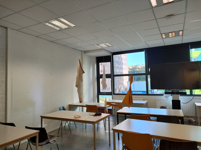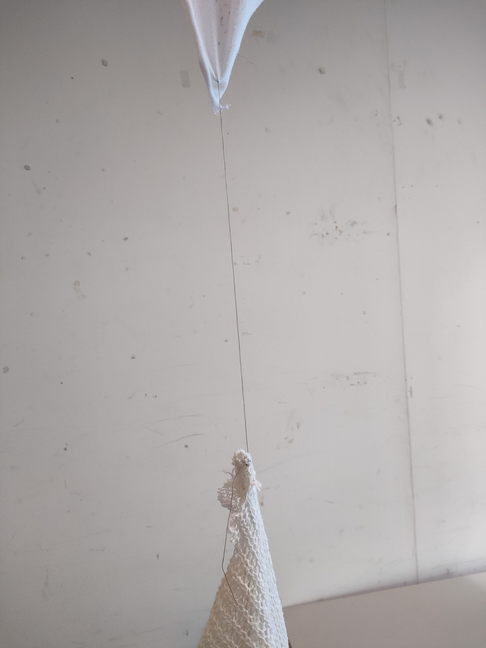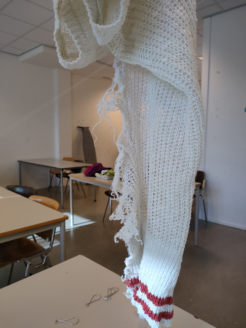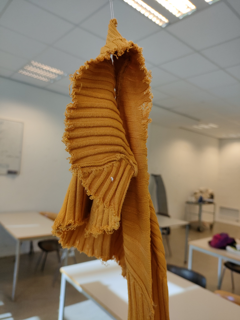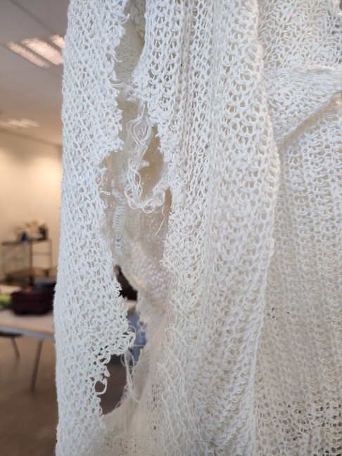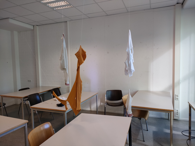De kleding had ik in een halve cirkel gehangen zodat je er in kon staan. Van een afstand was niet meteen te duiden wat het was. Het voelde een beetje alsof je niet dichterbij mocht komen. Het was niet uitnodigend op die manier. Als je eenmaal dichterbij kwam en tussen de kleding ging staand, voelde het bijna alsof je in een apparte ruimte stond. Zodra je de kleding ging voelen kreeg je ook oog voor de details, zoals de mooie draadjes die los kwamen.