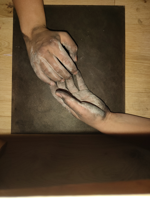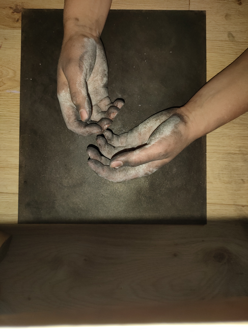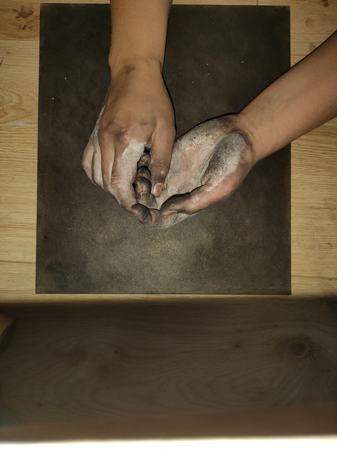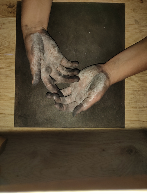 Ik was aan het kleien en vervolgens ging ik met houtskool aan de slag. Zoals je ziet had ik tussendoor mijn handen niet gewassen. Ik keek naar mijn handen en dacht: