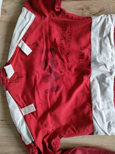 2 mensen doen een jumpsuit aan. Deze jumpsuit kun je aanpassen, bijvoorbeeld zwaarder of lichter, strakker of losser, dikker of dunner maken. Persoon 1 past de jumpsuit van persoon 2 aan, zodat de jumpsuit van persoon 2 voelt als de rouw van persoon 1. Persoon 2 voert dezelfde handeling uit bij persoon 1. Zo laat je elkaars rouw voelen zonder woorden