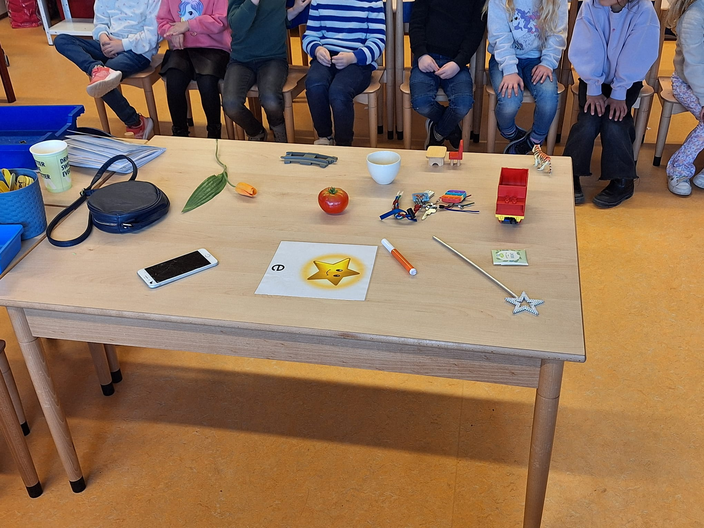 De juf gaat verder naar de volgende les. De kinderen herhalen geleerde letters en leren ook een nieuwe. Ze heeft de tafel vol gelegd met voorwerpen die met de ‘t’ beginnen. De kinderen moeten met elkaar overleggen welke nieuwe letter de juf wil horen. Ze gaat verschillende kinderen langs. Als iedereen snapt dat de nieuwe letter de letter 't' is, gaat de juf verder. Ze mogen nu zelf woorden bedenken die beginnen met de letter 't'. Die schrijft de juf op het bord.