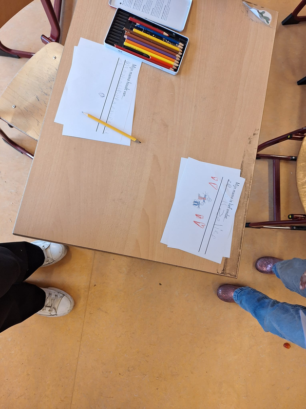 Ik observeer de laatste drie kwartier van een dag in groep 3. Ze zijn bezig met het maken van Moederdag cadeau’s. De kinderen hebben leren lezen en schrijven en mogen nu zelf opschrijven waarom hun mama lief is. De kinderen lopen vrij rond en er zijn gezellige gesprekjes aan de tafels. De juf loopt langs en vraagt aan sommige kinderen wat ze op schrijven. Er zijn veel momenten waarin de kinderen de letters leren, ze vragen het soms aan elkaar en kijken naar de letterkaarten.