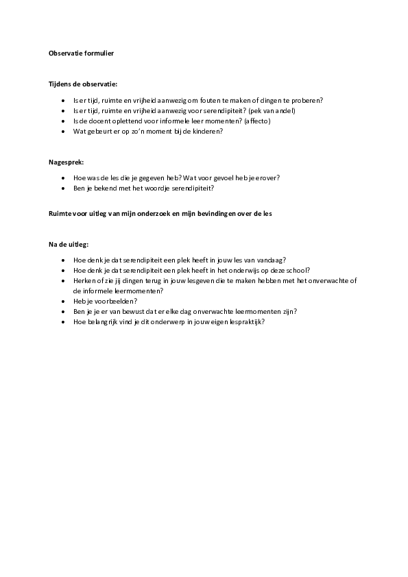 Omdat ik niet wilde dat hun lesgeven van te voren beïnvloed werd heb ik alleen een dag en tijd met de collega’s afgesproken. Ik heb ze verder niet verteld wat mijn bedoeling was. Elke observatie duurde een half uur. Na de observatie ben ik met een aantal collega’s gaan zitten en heb ik middels een klein interview het onderwerp serendipiteit besproken en uitgelegd. Ook was ik erg benieuwd naar de behoefte van mijn collega’s om dit in te kunnen zetten in hun lessen.