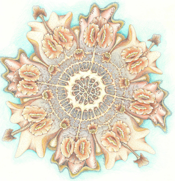 Ik was heel benieuwd of ze een voorbeeld kon geven over iets onverwachts wat ze heeft ingezet in haar eigen praktijk. Ze was op zoek naar een duidelijk voorbeeld, maar dat kon ze niet echt geven, omdat haar werkwijze eigenlijk altijd berust op onverwachte dingen. Ze werkt bijvoorbeeld met mandala’s, ze noemt ze ook wel tondo’s. Ze begint vaak met iets in het midden en dat groeit dan vanzelf. Datzelfde heeft ze ook met keramiek, wat ze ook een tijd heeft gedaan. Ze kijkt vaak om zich heen en let op patronen en motiefjes. Soms gebruikt ze die dan in haar werk en ontstaat er in de restruime vanzelf iets anders.