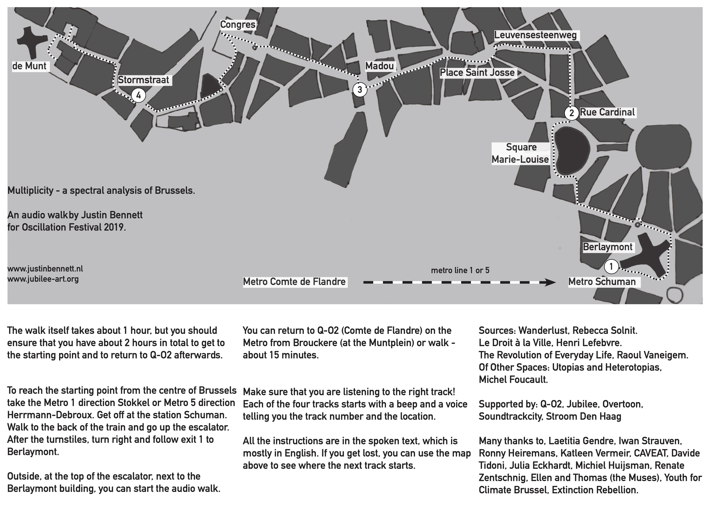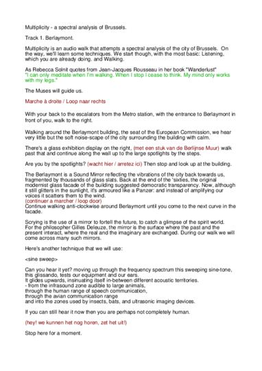 As an artist working often with audio walks I often have the nagging thought: does using headphones to present sound in public space immerse the listener in a bubble, separating them from their surroundings? This research looks at the form of the audio walk and the possibilities of using binaural recording, narrative devices and locative media to prioritise engagement with the environment. In addition it documents the re-activation of an older work of mine in a app using geo-location and it collects documentation of a number of walk-pieces including scripts, audio files, maps and other background information. Lectorate Music, Education and Society, Koninklijk Conservatorium, Den Haag. 2023-24