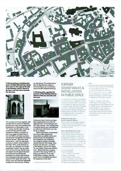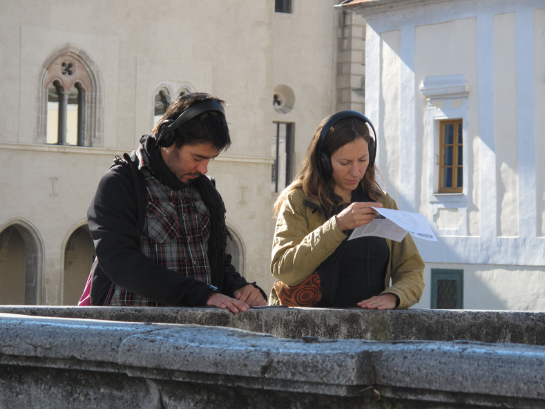 Extra content can be added by using other media or interventions. A simple example is the use of a map which also contains other information (see the book of Rumours / Resonances). With the Krems version of Spectral Analysis all the text was printed. This allowed the listener to read the information, sometimes with instructions on where to stand and how to behave, in their own time and their own language, keeping the sound pieces more abstract and open to interpretation. A recent audio walk made by students of mine used the very simple device of pasting drawings onto a wall in a semi-public space. The audience was simply told to follow the drawings.