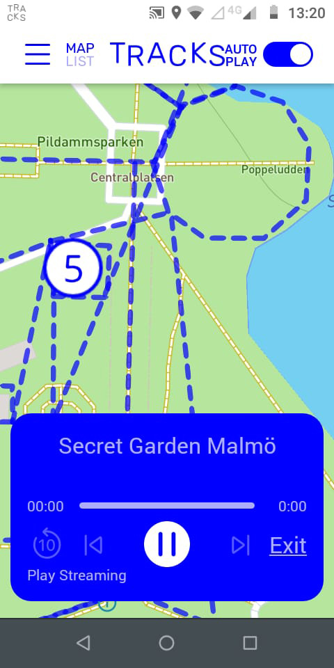 Using Tracks (or Echoes) it is possible to design the piece so that the areas containing audio are visible on the device's screen or not. In Tracks there is also the option of drawing lines on the map, which could be interpreted as the intended route, but they can also be used to define areas which may or may not be linked to the sounding areas. These tools make it possible to encourage various ways of moving through the city and ways of interacting with the sound. A single route through the city where the audio-areas are hidden will encourage a linear reading of the piece, even when it is made out of many fragments or layers. A collection of shapes spread around a neighbourhood will encourage exploration like a treasure hunt. For instance in Secret Garden Malmö I divided a circular area of the park into segments with lines leading to a small circular area in the middle. Approaching this area made all the other sounds fade out to silence, so that the listener could simply hear the live sound of the environment at that point. Defining a larger area of the city with lines could simply define the boundaries of an area to be explored, without the listener needing to look at the screen.