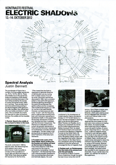 In some cases, when the piece was hosted by a venue, it has been possible to include images and / or extra sounds in spaces - not just on the headphones. The last episode in Spectral Analysis WG layers sound on headphones with sound in the surrounding space. Whereas the headphone sound fades out at the end, the sound in the space continues indefinitely, making it unclear to the listener when the piece has finished.