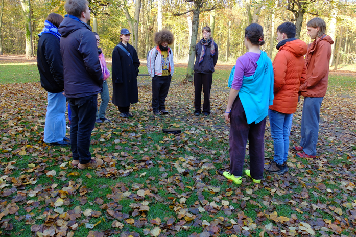 One group ditched the headphones completely for their procession through a park with portable loudspeakers. The sounds did truly blend (and compete) with the sounds of the environment, but also, by leaving space for listeners to move around and hear things from different perspectives, they encouraged interaction and engagement. Standing around a loudspeaker concentrated the listening of the whole group, even when it was not producing any sound.