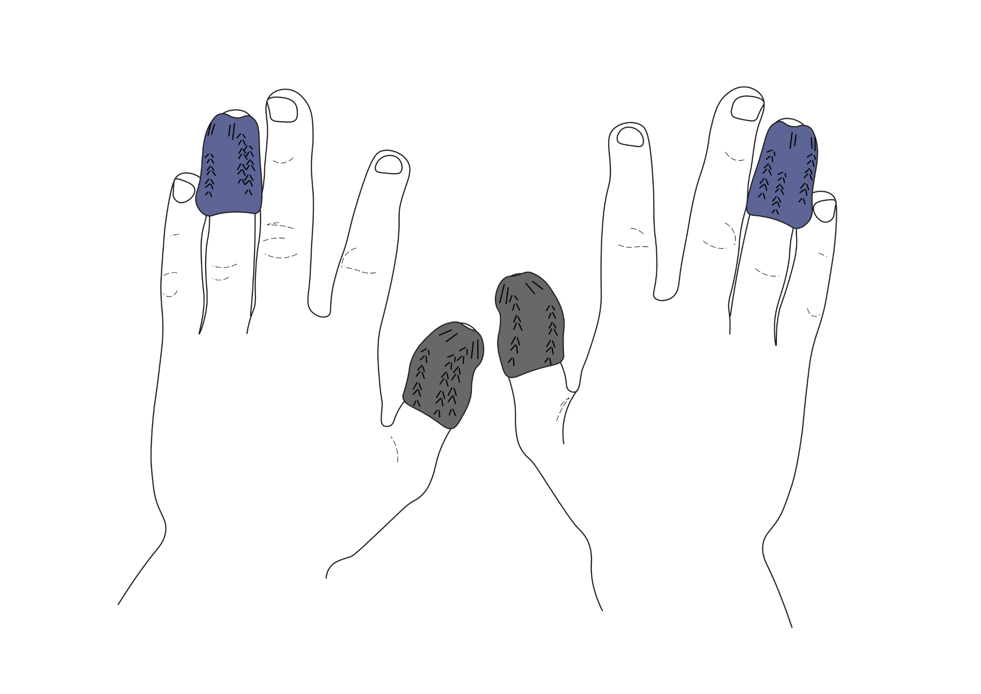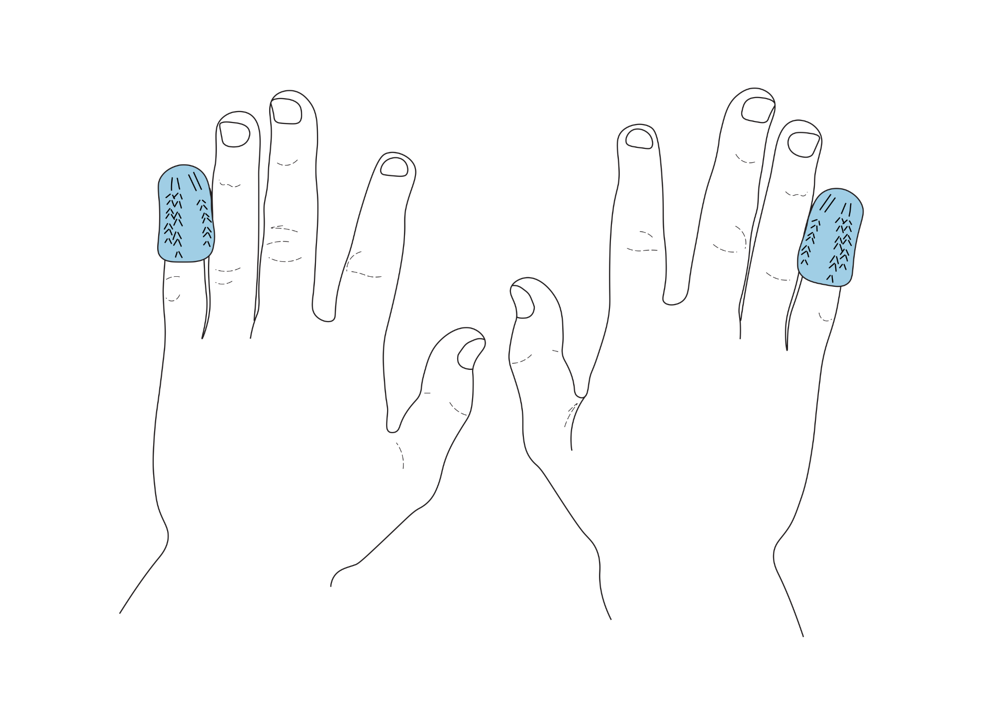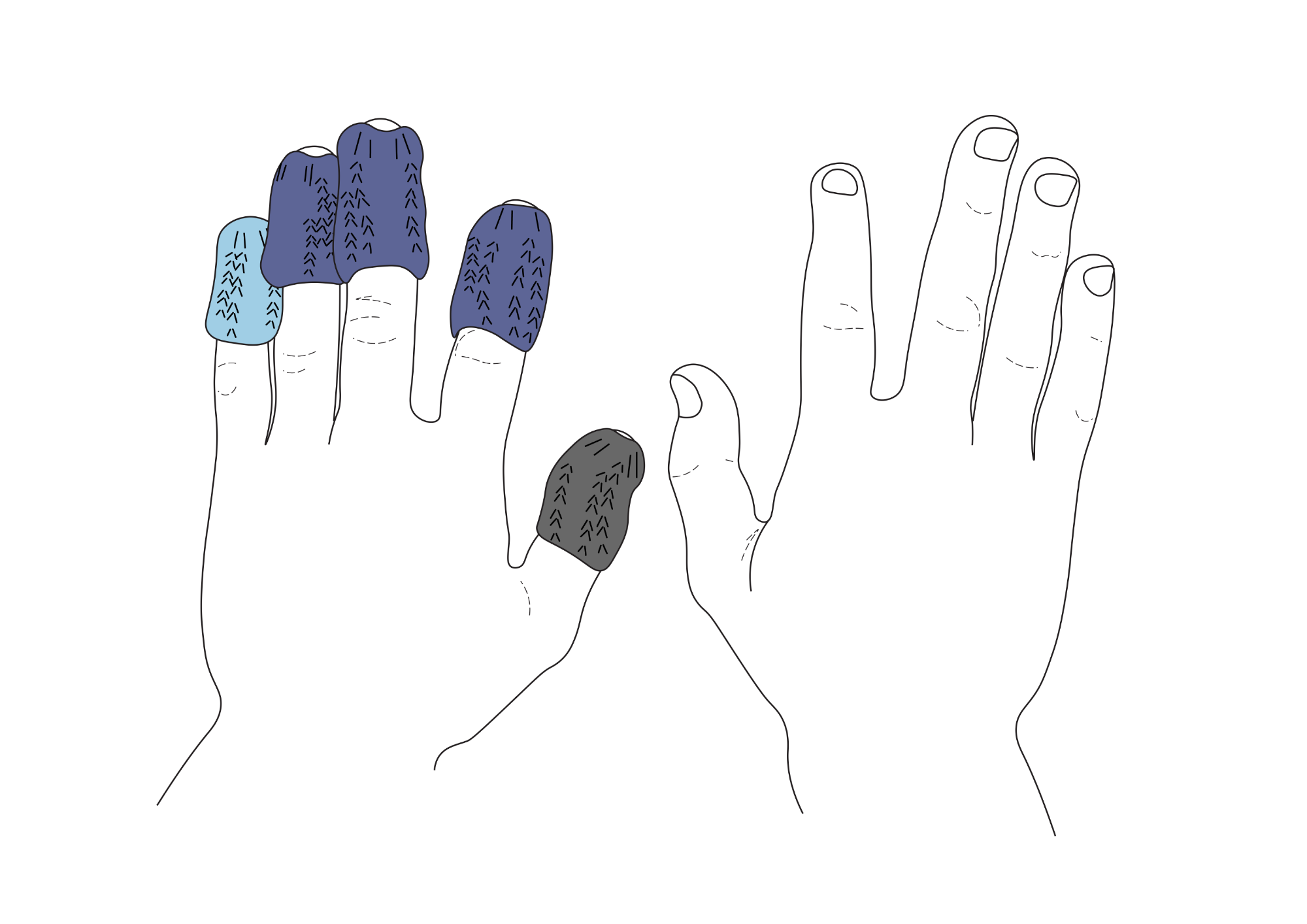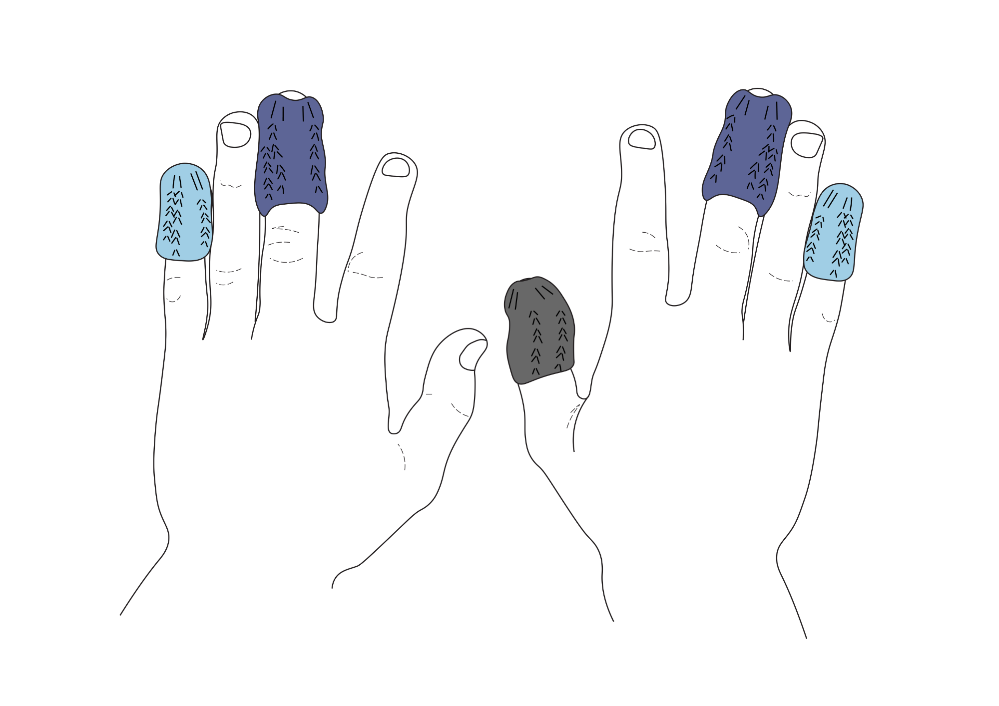 Begin by dressing in one of the suggested and drawn finger sleeve combinations below. Start with wearing four or five sleeves.