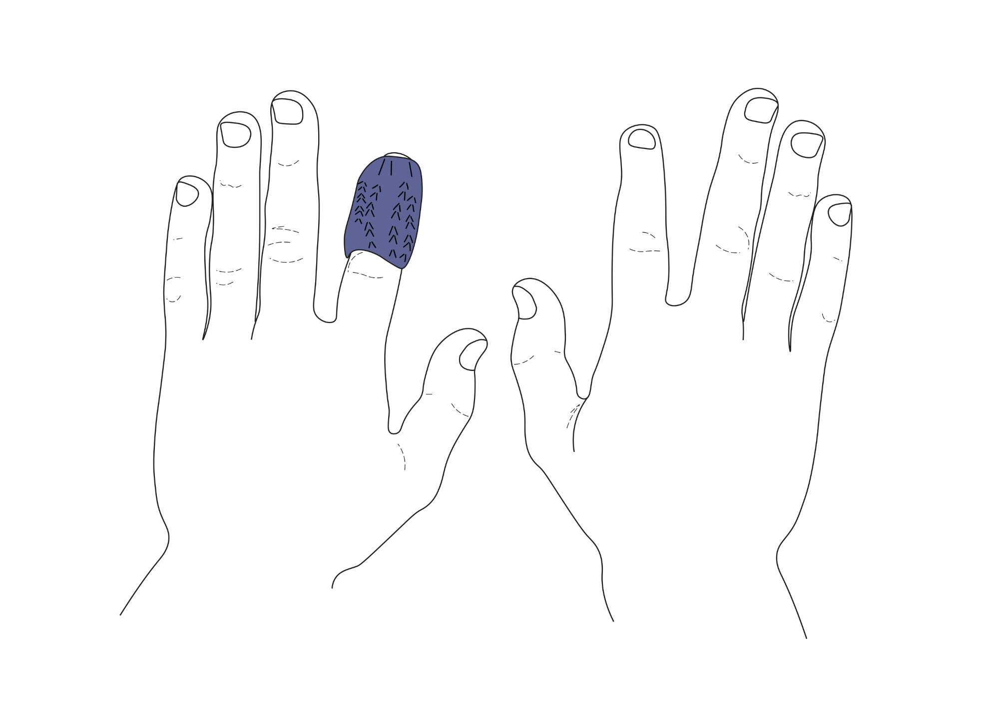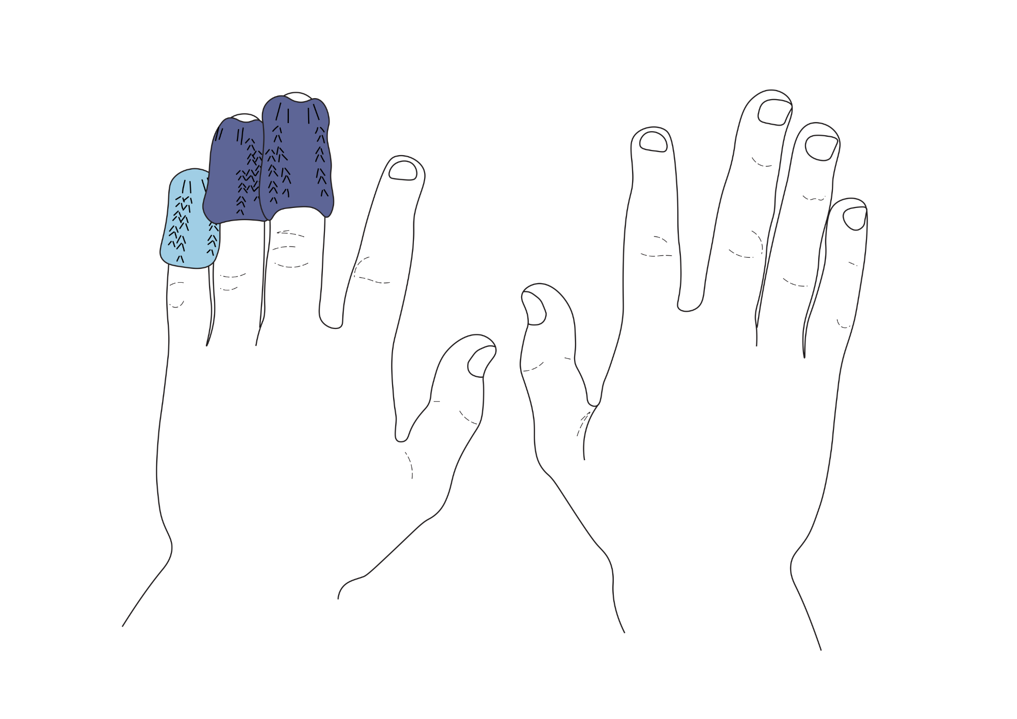 - Three sleeves on one hand on the little finger, ring finger and middle finger.