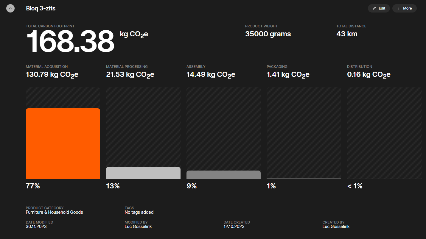 De Bloq 3-zits is 1 van de meestverkochte banken van Design on Stock. Ik was nieuwsgierig naar de CO2-impact van de productie van 1 zo'n bank.