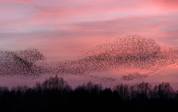 Een zwerm spreeuwen die op haar mooiste momenten een synchroon bewegend organisme vormt en soms ook alle kanten op vliegt.