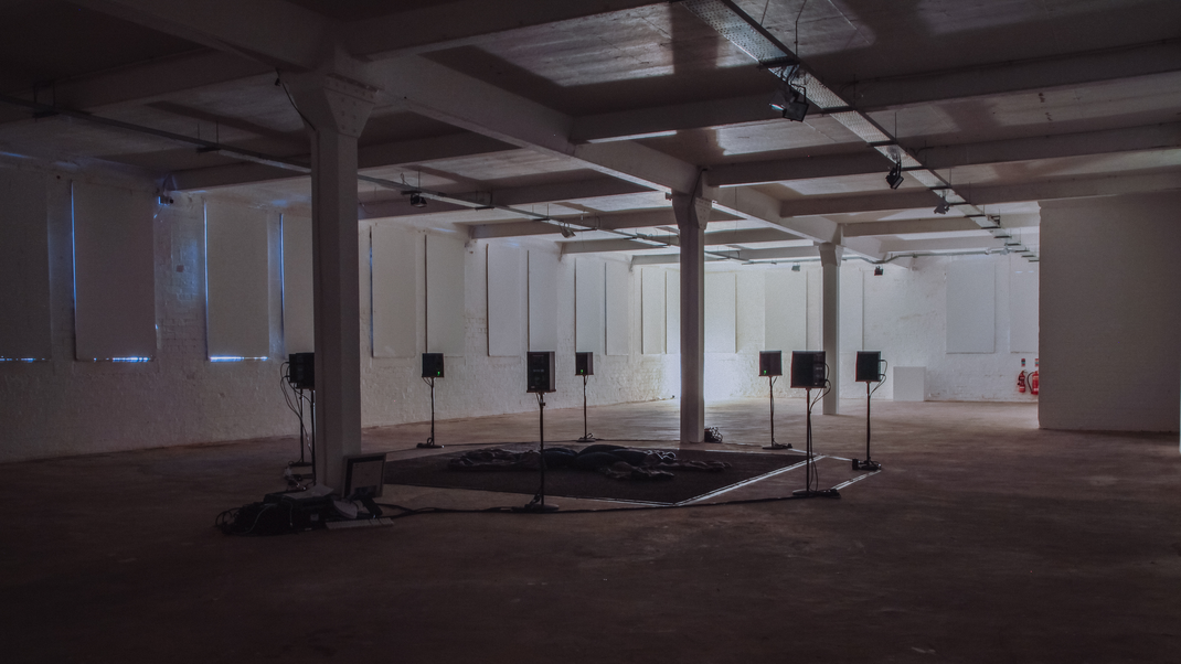 48Hz by Miguel Negrão. Installation view. The large gallery space at Platform on Queen Street in Belfast was darkened with boards over the windows and was empty aside from a small ring of eight loudspeakers and a rug with cushions in the center of the room. Image courtesy of Matilde Meireles