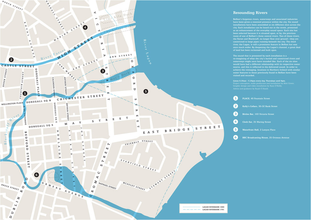 Map of sound installations for Matt Green’s Resounding Rivers. Each location was chosen to mark the historic presence of waterways in Belfast, such as a culverted river that used to flow through the city center. Graphic design by Ryan O’Reilly. Image courtesy of PLACE