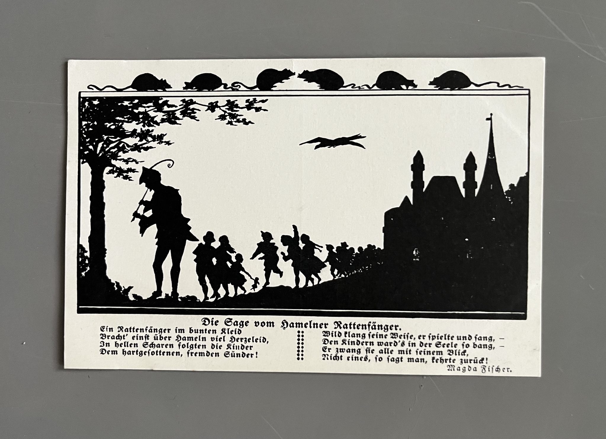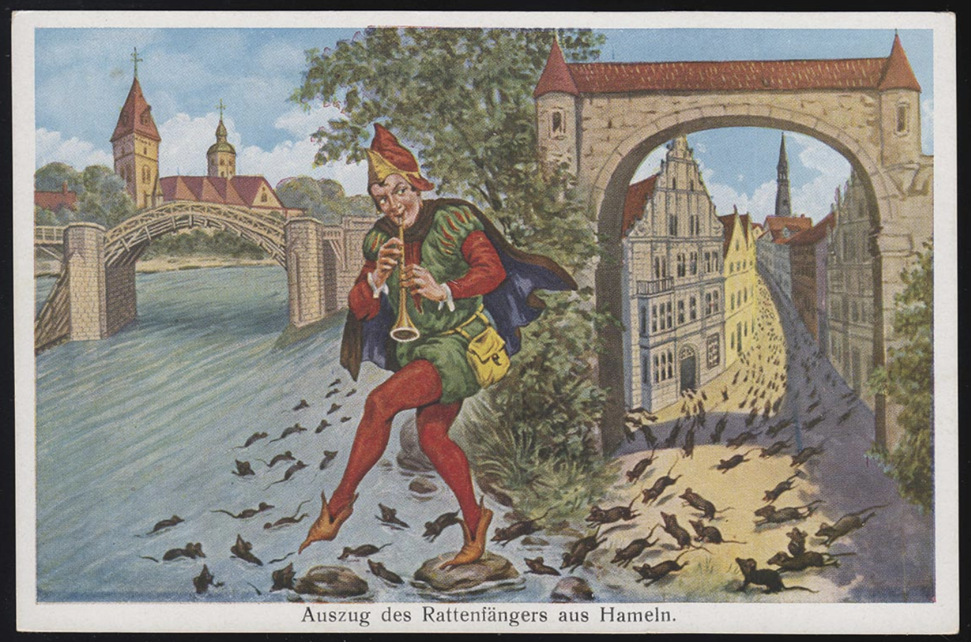 He sounds his fife in the streets, but this time it is not rats and mice that come to him, but rather the children: a great number of boys and girls from their fourth year on. Among them is the mayor’s grown daughter. A swarm of 130 children follows him, and he leads them into the mountain of Koppenberg, where they disappear with him.