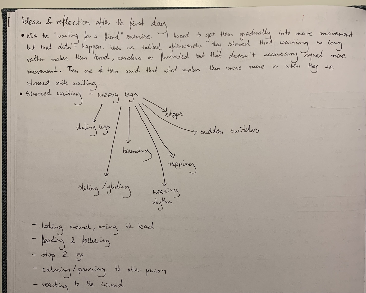 I started the physcial research of waiting by myself to see how I interpret the concept of waiting, what movements I do when I have to wait for something or someone and then I contacted my friends to help me with my research. I did that as I wanted to see how others wait as well as to get more inspiration for the movement material. It was also an opportunity for me to see how I could guide the performers I will get for the Making Space project. It really worked for me how I started - beginning on the inside, from being the perfromer and physically researching and trying things out, and then going to the outside and observe. I first got to see how my body feels when waiting and how it reacts to it and then I got to witness it by watching my friends. We also exchanged so that sometimes I stepped in and they could watch. I thought it would be good for them to see it from the outside, it could give them more ideas for their exploration and also I thought that me researching together with one of them would make it easier for me to guide them and show things that I want to research rather than only usig of words to express my ideas.