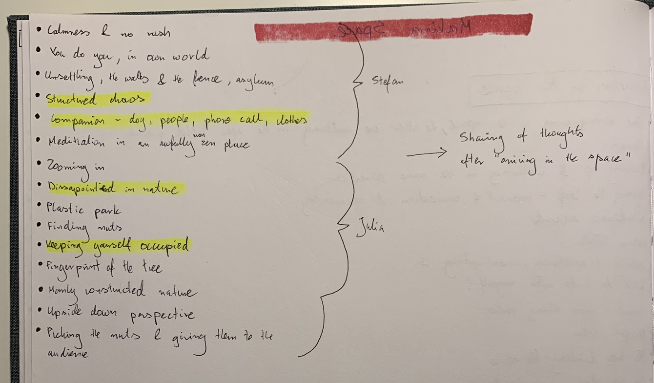 Everyday (besides Friday, the day of the presentations) I started the rehearsal with an exercise that I called "arriving in the space". In the previous Making Space projects, when I was in the role of the performer, the makers always started the rehearsal with letting the perfromers walk around the sapce and write down thigns they observe or that come to their minds while exploring the location. I wanted to do somehthing like that but a little bit differently. I did not want my performers do the same thing over and over again (as they also had the experience of being performers in the other Makins Space projects) and because I wanted to shate with them something that comes choreographic practices. This resulted in "arriving in the space". This is what I said to the perfromers: