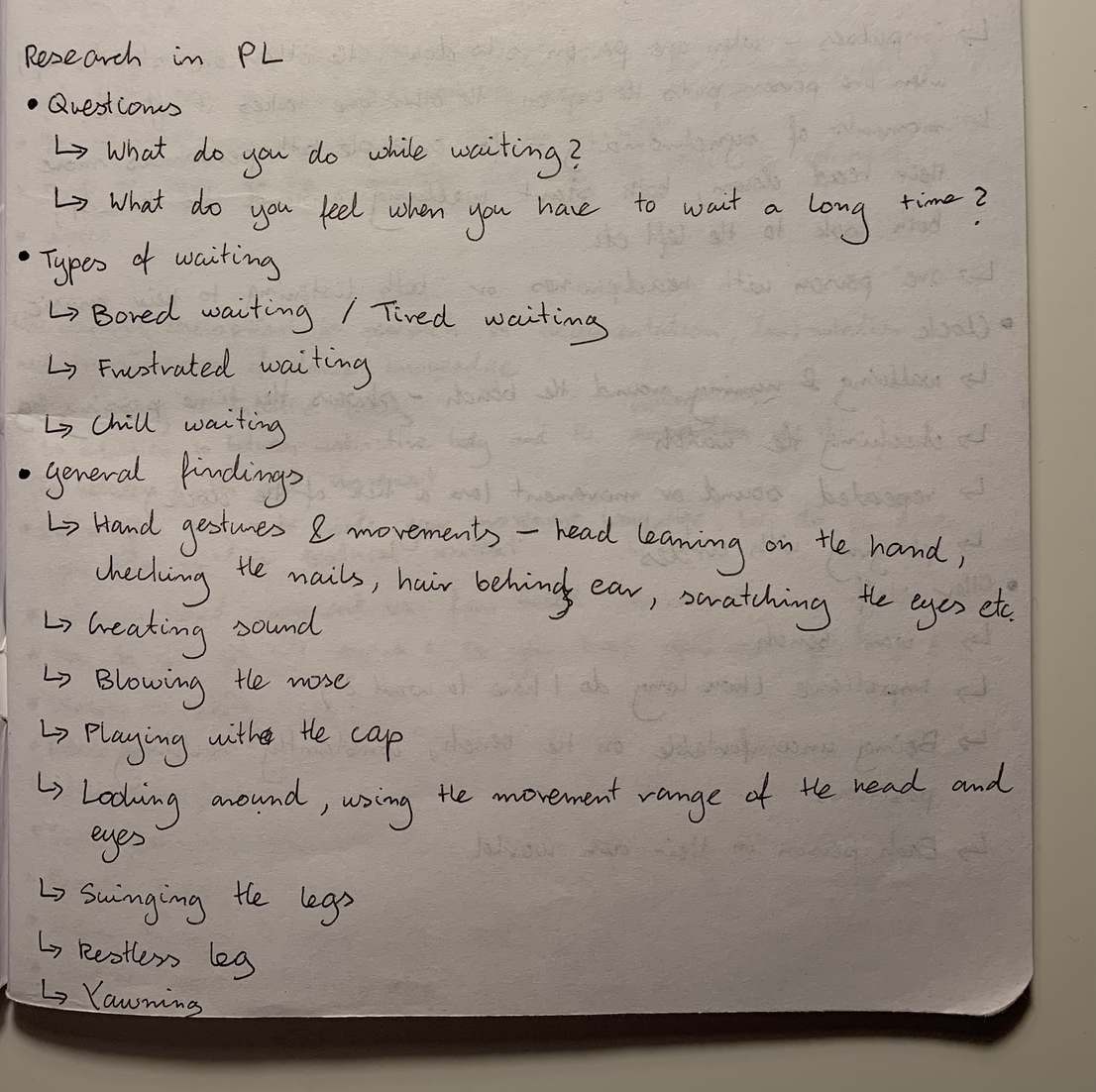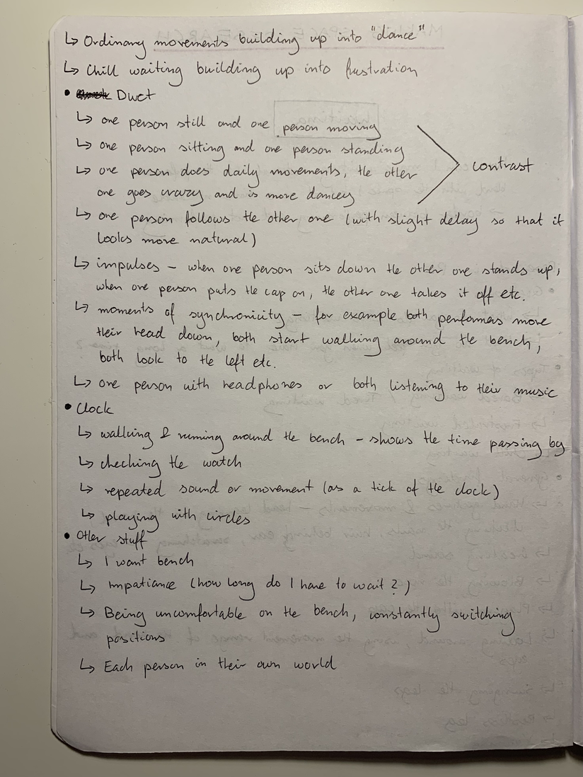 With my concept of waiting I wanted it to grow into more movements, that is starts quite relaxed and then the movement builds up as a result of frustration that you have to wait for something or someone for so long. On the first day I did a guided research with my performers that I thought would lead them to build up the movement and have more switches and dynamics yet that did not happen. I did not know how to get them there. After the guided research we shared some thoughts and somehow we got to the concept of stressed waiting. One of my performers said that when they have to wait for so long then at some point they give up or do not care anymore and that it would rather be stress that would make them move more. They gave the example of waiting on the train station for their friend where they have to catch this one train in order to make it to their flight. They are waiting for their friend, the train is about to come but they are still not there. The stress comes that their friend will be late and they will miss the train and so the flight. They shared that this is what makes their body uneasy and that is where all the daily movements come out. For this reason I decided to go with "stress waiting" instead of "frustrated waiting". For me it is the frustrated waiting that makes my body move but for my performers is the stress waiting and as they are the ones they are going to perform it was the smart decision to go with what makes their body uneasy while waiting. In conclusion, the concept I had took a slight turn, not neccessairly movement ideas I had but more in the words I use to describe it.