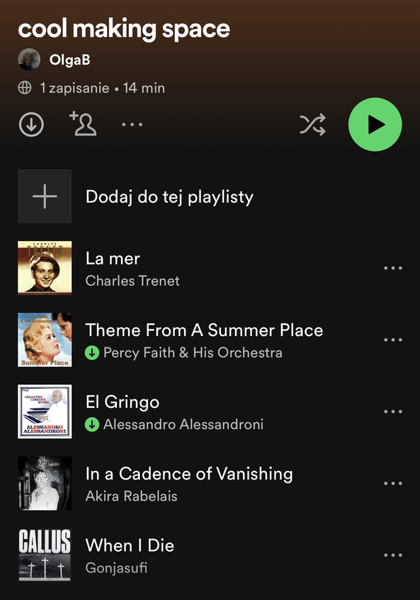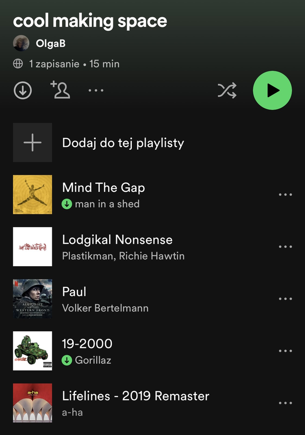 In the first 2 days of rehearsals we never used music. As music is a big inspiration for me, I decided to use it for the 3rd day of "arriving in the space". It was purely to experiement, I wanted to see what affect music would have on my performers. I created a playlist with 5 songs, there was no reason behind why I chose these specific songs. The only thigns was that I wanted to mix various styles and energies. While my performers were in the task, I observed them while also listening to the playlist. It was very interesting to see it, the experience was totally different.