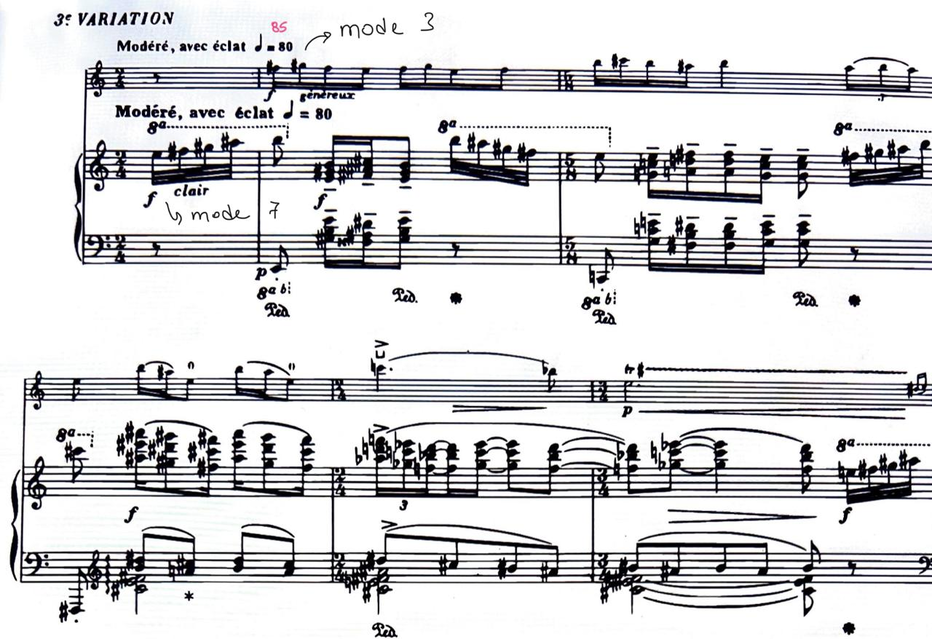 Messiaen generates tension here, a climax compared to what we heard with mixed meters and aggressive dynamic markings. We can divide this variation in the following sections: bars 85-96, 97-100, 101-109, and 110-114. Analyzing in terms of modes of limited transposition is challenging throughout the piece since it is not always clear when Messiaen uses appoggiaturas, passing notes, enharmonic progressions or when a new mode is introduced. In the case of the 3rd variation, we have to deal with polymodality (polytonality within the context of modes). The violin and piano do not share the same mode anymore.