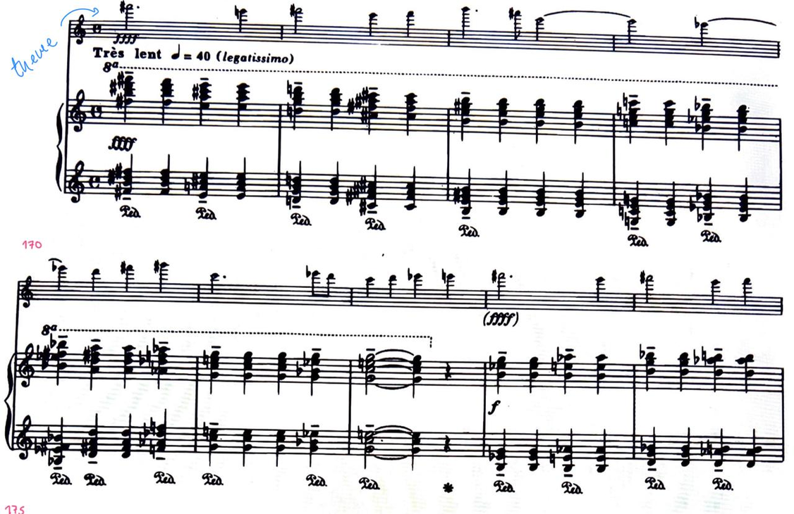 We could divide the final variation into the following sections: bars 166-179, 180-185, and 186-203. In this variation we hear the theme again only it is an octave higher in the violin and the piano carries a completely different material consisting of double 4-voice chords with octave doublings. In the opening section (bars 166-179), the composition predominantly adheres to the note collection of Mode 31, deviating slightly in bars 178–179 where there's a subtle shift to what could be identified as Mode 34. This alteration sets the groundwork for the subsequent section, which Messiaen crafts in Mode 62. Transitioning to the middle segment (bars 180-185), the violin part ascends by a semitone relative to the main theme, introducing a heightened sense of tension and variation. Notably, bars 183 and 185 introduce A# as a passing note, momentarily diverging from the established pitch collection.