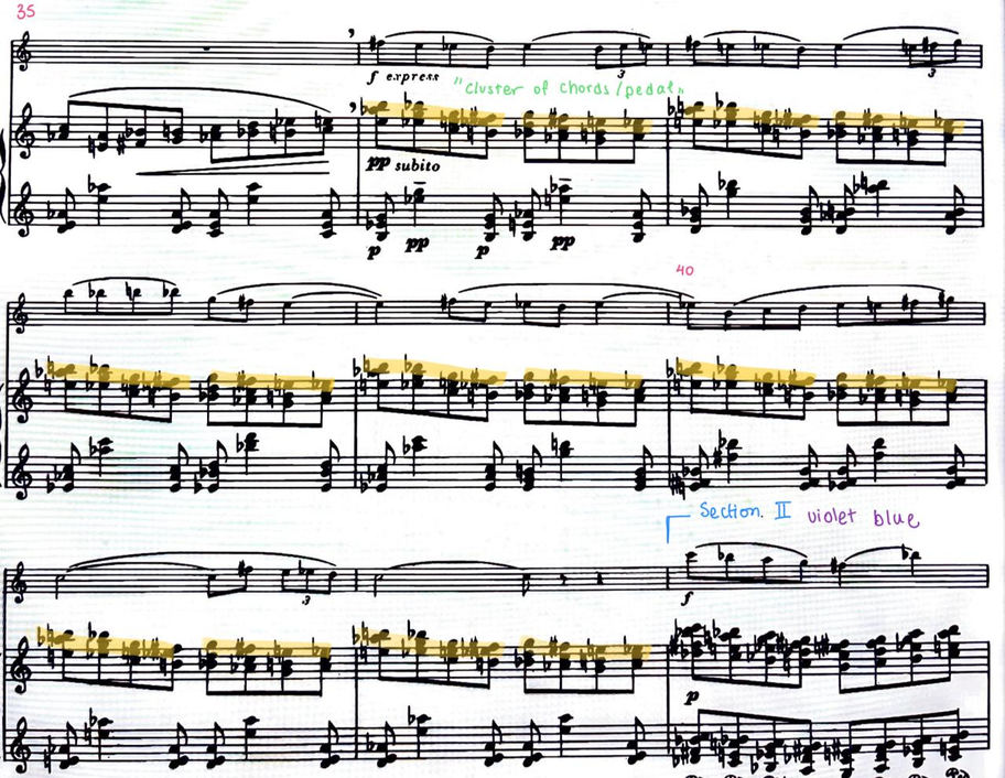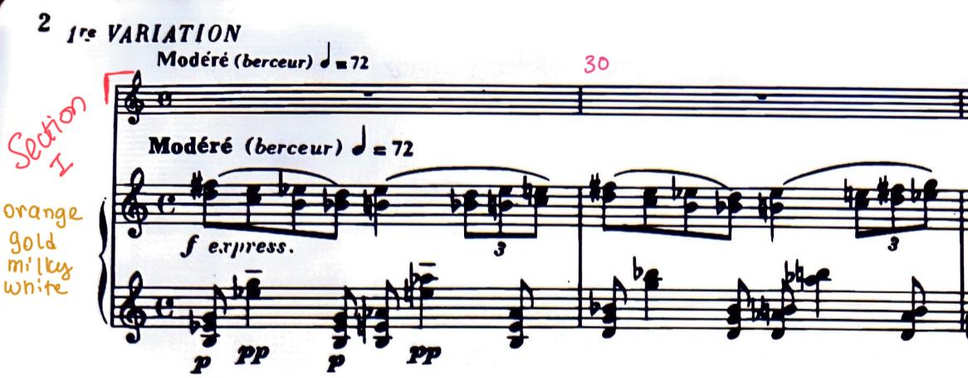 After investigating this aspect of Messiaen’s Theme et Variations I definitely encourage everyone to pursue this analysis and find reasoning for choosing one mode over another. It is usually hard to know exactly if a note outside of the pitch collection of the current mode is just a passing note or an introduction to a new one. It does make a difference since the importance and expressiveness shall be different. After sorting out the layout and modes I would advise to write on the score the colours that Messiaen suggests and if possible, make an image out of them. I could come up with clouds during dawn or sunset and flowers mostly. This awareness helped me a lot with the piece, it lead to a different way of listening and comprehending it.