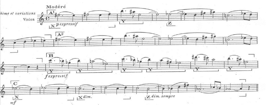 For the purpose of this thesis, the following section delves into an analysis of Messiaen’s Thème et Variations for Violin and Piano, specifically exploring the correlation between the modes of limited transposition and their associated colours, as recounted by Messiaen himself. Ideally, this study will lay the groundwork for further investigation into the unique chords that characterized Messiaen's early compositions. My analysis seeks to approach the piece from a fresh perspective, offering insights for music appreciation, highlighting nuances for attentive listeners, and proposing avenues for aspiring performers to transcend mere technical proficiency and attain a deeper musical expression.