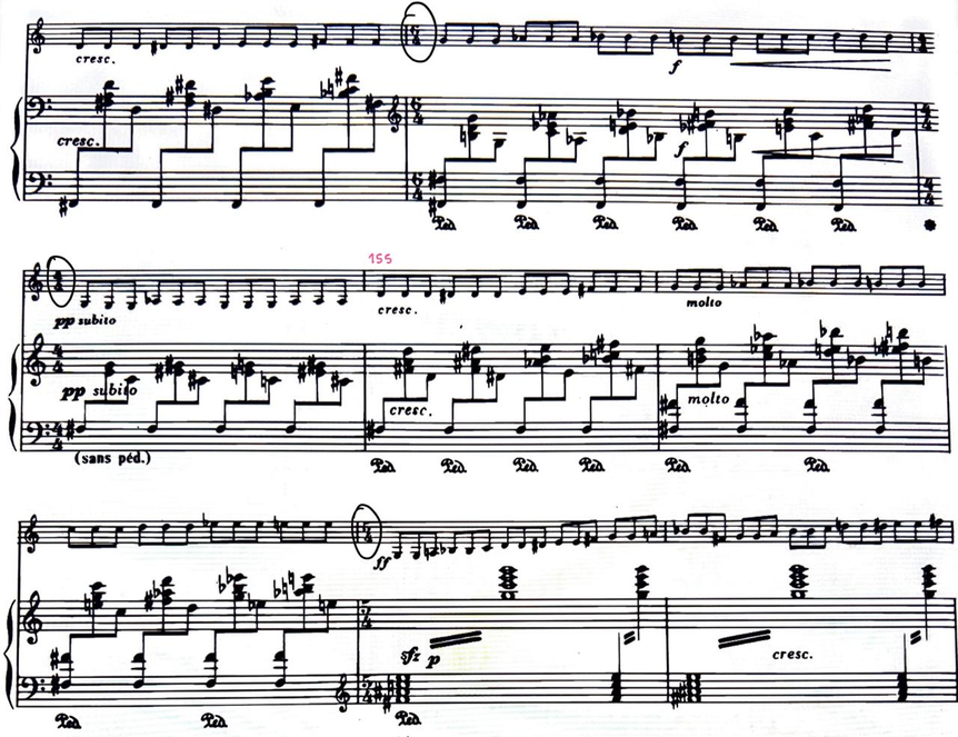 In the tradition of the First Viennese School, periods (comprising antecedent and consequent phrases) typically consist of even numbers, such as 4+4 or 8+8. However, Messiaen diverges from this convention by dividing the period into odd numbers, adding a distinctive element to his compositional technique while drawing inspiration from the Classical period. ⁂ (We know Messiaen was fascinated by non-retrogradable rhythms, and patterns from Hindu and ancient Greek music. There are also discussions on the relationships between prime numbers and elemental music in his works). ⁂