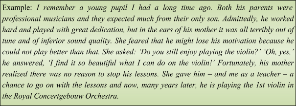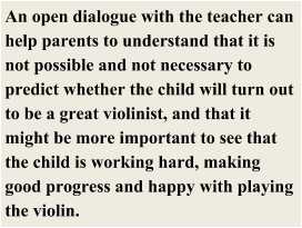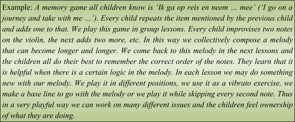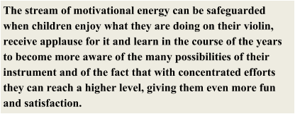 Abstract Title of Research: Violin education in middle childhood. Research Question: How can an optimal musical and violinistic development be achieved in the teaching of children in middle childhood? Summary of Results: In middle childhood (7-11/12 years) enter a new phase in the development of their cognitive functions, their motor skills and social behaviour. In this research I investigate how these developments should be understood from the perspective of violin teaching to children in this age group and how these developments can be used by the teacher to the benefit of their education to become all-round violinists and musicians. For this research I studied the relevant literature in the field of development psychology and the training of young talents and I compared the scholarly theories and insights with my personal experience as a violin and violin methodology teacher of more than 20 years. In this thesis I describe the great potential that violin teaching to children in middle childhood offers, provided that the teacher has a good understanding of the learning process of the child, a clear vision and long-term strategy for the teaching and tremendous patience. Central elements of this vision should be a clear overview and balanced approach of all the different elements that make an expert violinist and all-round musician, the flexibility to respond and adapt to the specific abilities and needs of each individual pupil and an approach that fully involves the child in his/her own learning process.