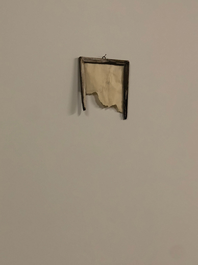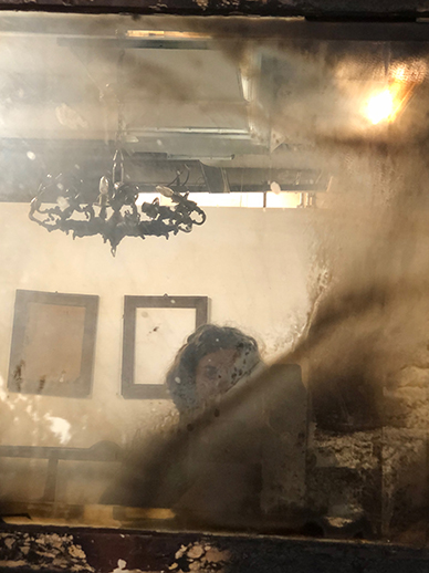 Staring at myself in the mirror, I can either become part of the crime scene by looking at myself through the unburnt part of it or become part of the erased by looking at myself through the burnt section of the mirror.