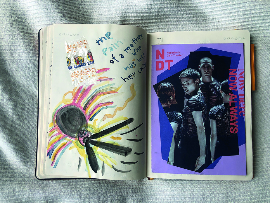 I pick up a delicate booklet from the box filled with things from previous years at the academy that I never look at anymore. Uneven pages stick out. The smell of paper. Traces of usage from passing history and future between multiple fingers and hearts. Single pages held together by a few strings, like memory – fractions of our minds tied together by the strings of our imagination.