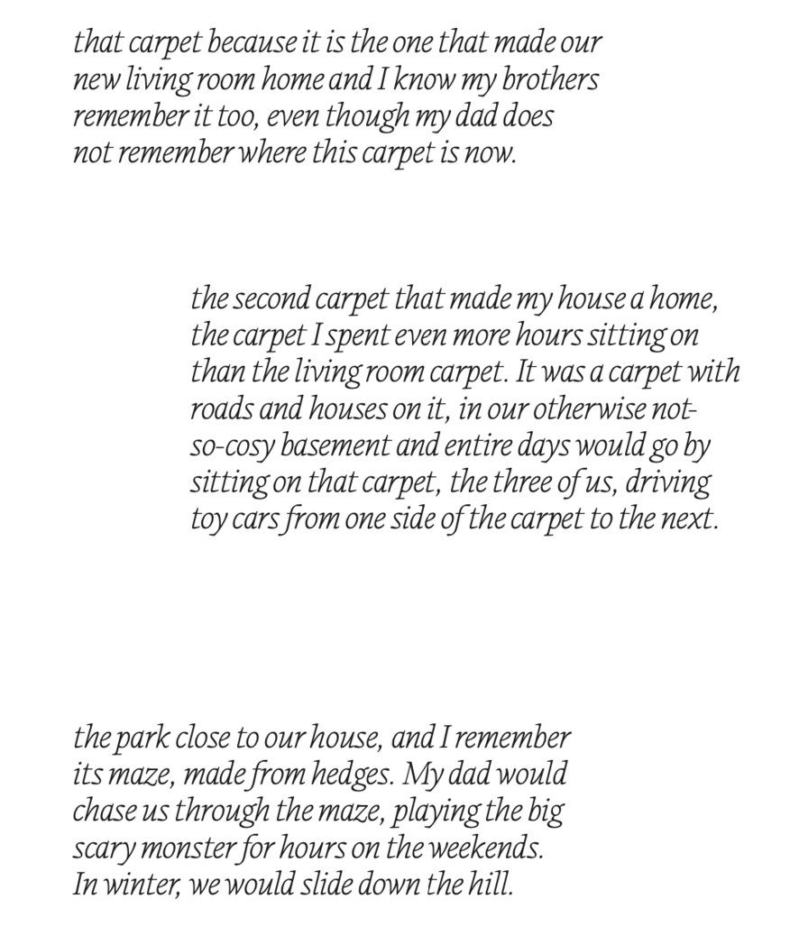 will all hold together. I remember the little rips in my tracing paper, like the scars of our memories. And I remember stitching them back up as if my delicate and weak string could do anything to soothe the aches of my family.