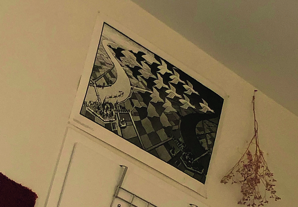 It’s that same Escher painting, that I am looking at now. It came to me in the form of a poster, about to be thrown into the bin, before M. handed it over to me, jokingly. “Do you want this?”, she asked. “I’m going to throw it out, it belonged to one of the former roommates here.” I took the poster out of her hand and unrolled one edge. When I realised which image it was, I tightened my grasp. “I will take it.”