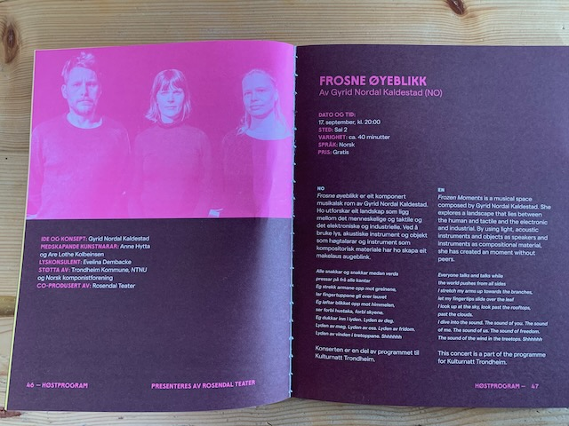 Frosne øyeblikk er eit komponert musikalsk rom av Gyrid Nordal Kaldestad. Ho utforskar eit landskap som ligg mellom det menneskelige og taktile og det elektroniske og industrielle med bruk av akustiske instrument, objekt som blir til høgtalarar og instrument, og lys som ein del av det kompositoriske materialet.