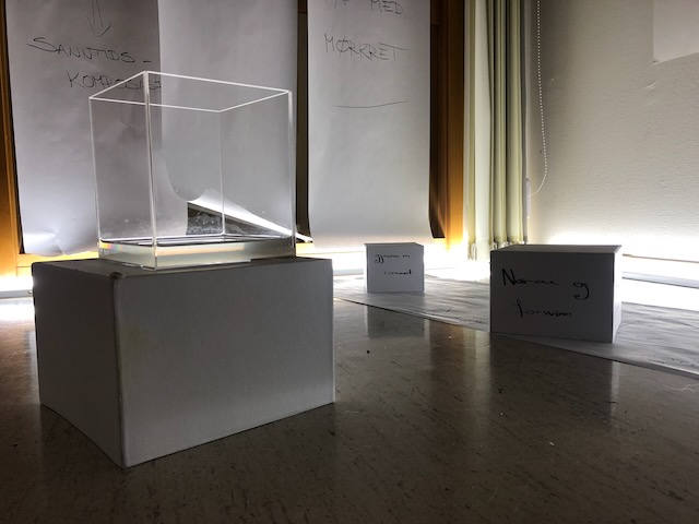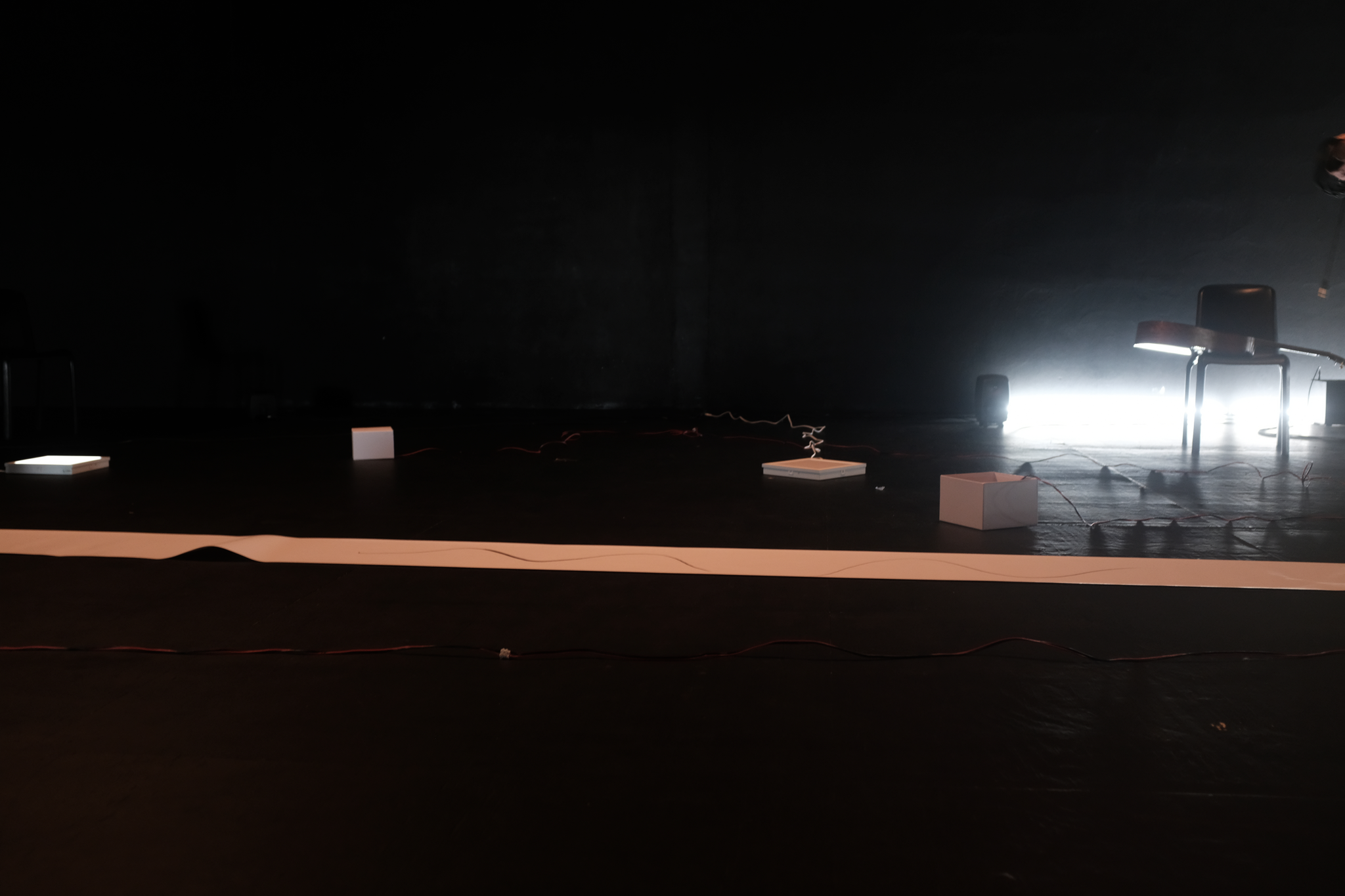 Eg har i fleire prosjekt brukt kvadratiske boksobjekt av ulike materiale som instrument og høgtalarar, og bestemte meg i stipendiatprosjektet for å konsentrere meg om objekt av papp. Grunnen til dette heng saman med at eg ville bruke lyden av skriving som ein del av lydbildet, og testa i dette verket ut ulike måtar å bruke objekta på. I og med at hovudveiledar Øyvind Brandtsegg har det å arbeide med å utvikle feedbackisntrument som eitt av sine forskingsområder, var det naturleg at eg ville utforske korleis objekta av papp også kunne brukast som feedbackinstrument. Eg arbeider både med desse som instrument, oppmikka med kontaktmikrofonar som eg loddar sjølv, samt som høgtalarar, der eg festar transduserar (Visaton EXS60 og EX60) til objekta. Les mei utfyllande om desse instrumenta under Sjølvlaga instrument på sida Som om eg har vore her før.