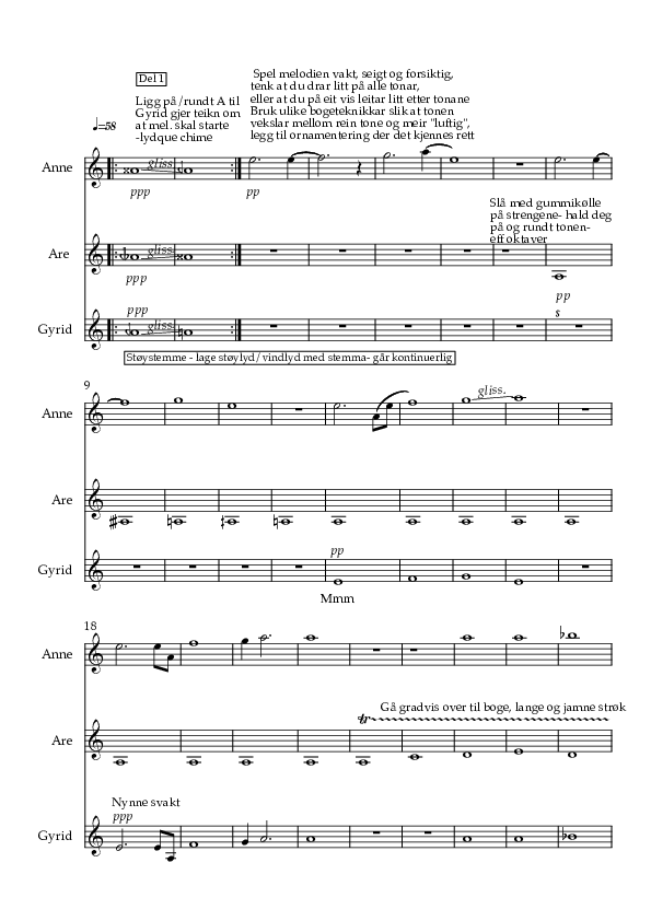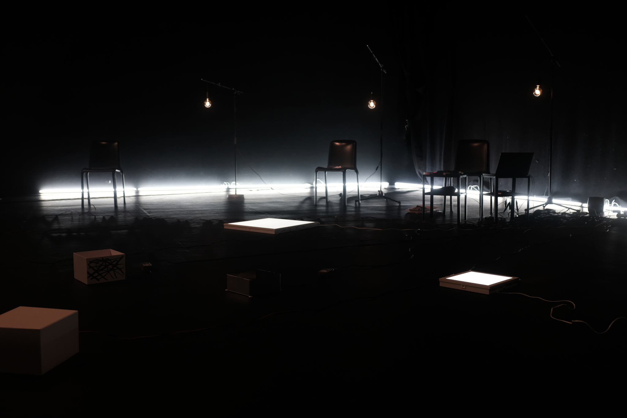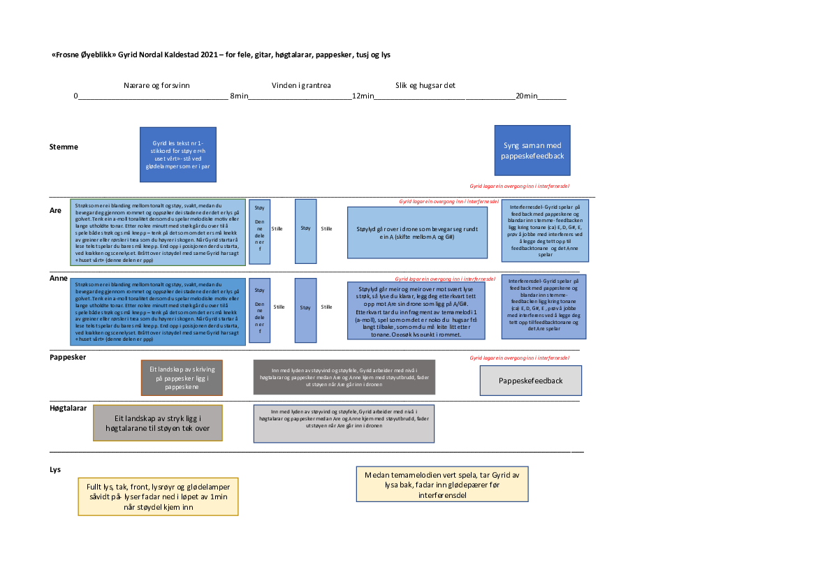 Eg ville i dette verket prøve å arbeide med tre ulike lydelege fokus- den akustiske lyden av gitar, hardingfele og stemme, pappesker som elektroakustiske instrument, høgtalarar og feedbackinstrument og lyd spela av via fire høgtalarar plassert på golvet med litt ulik avstand til publikum. Det lydlege tok utgangspunkt i to tekstar som eg hadde skrive som del av prosessen med å skrive meg inn i minner om lyd våren og hausten 2020. Tekstane var eigentleg ikkje meint å skulle lesast høgt, dei skulle vere ein del av partituret og ein del av utgangspunktet for det musikarane skulle ha for å framføre verket. Kanskje ein kan kalle det for eit stemningspartitur? I og med at eg ofte arbeider med ein type tidslinje- og tekstbaserte partitur, brukar eg også små dikt og strofer som del av desse.