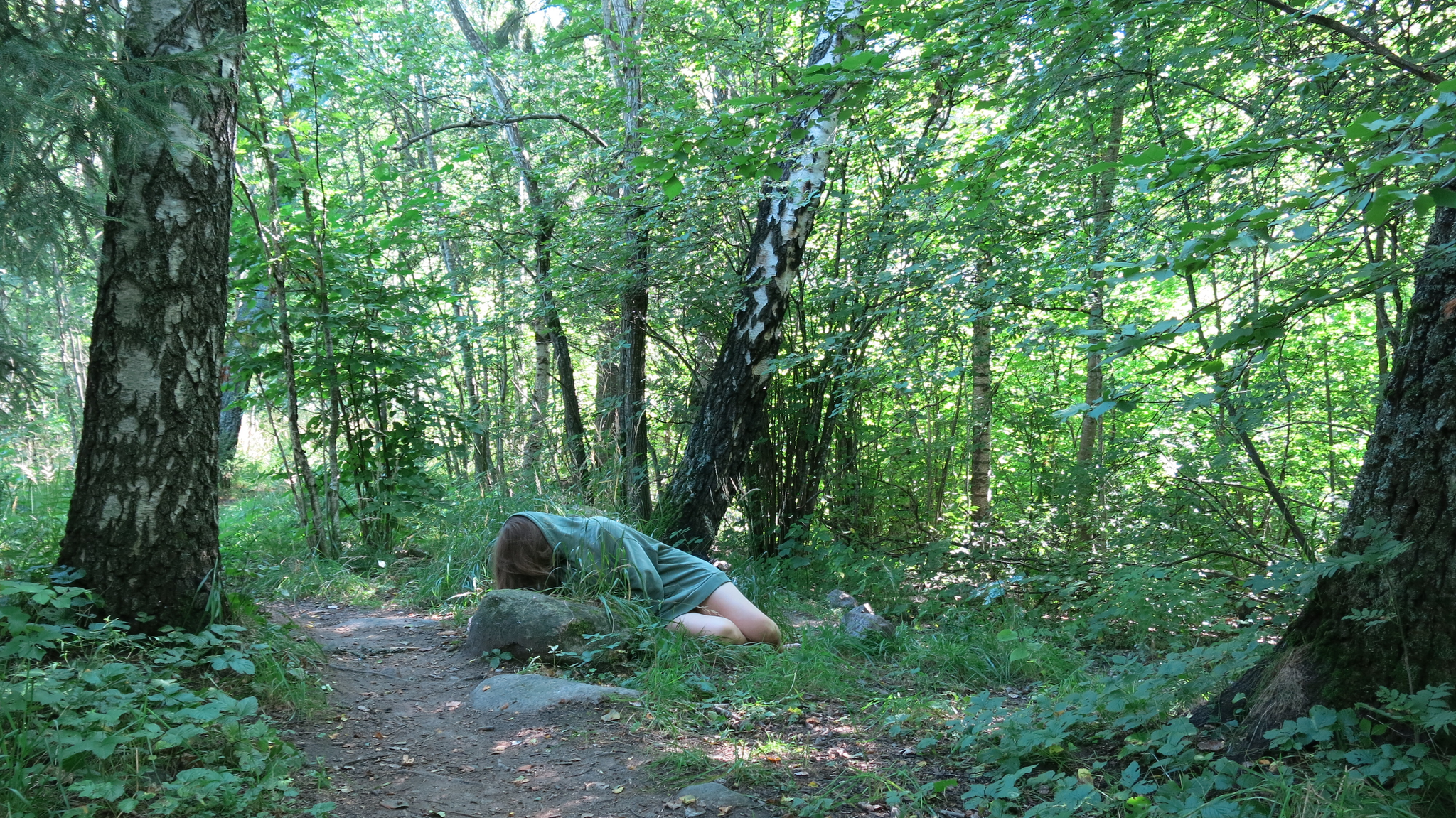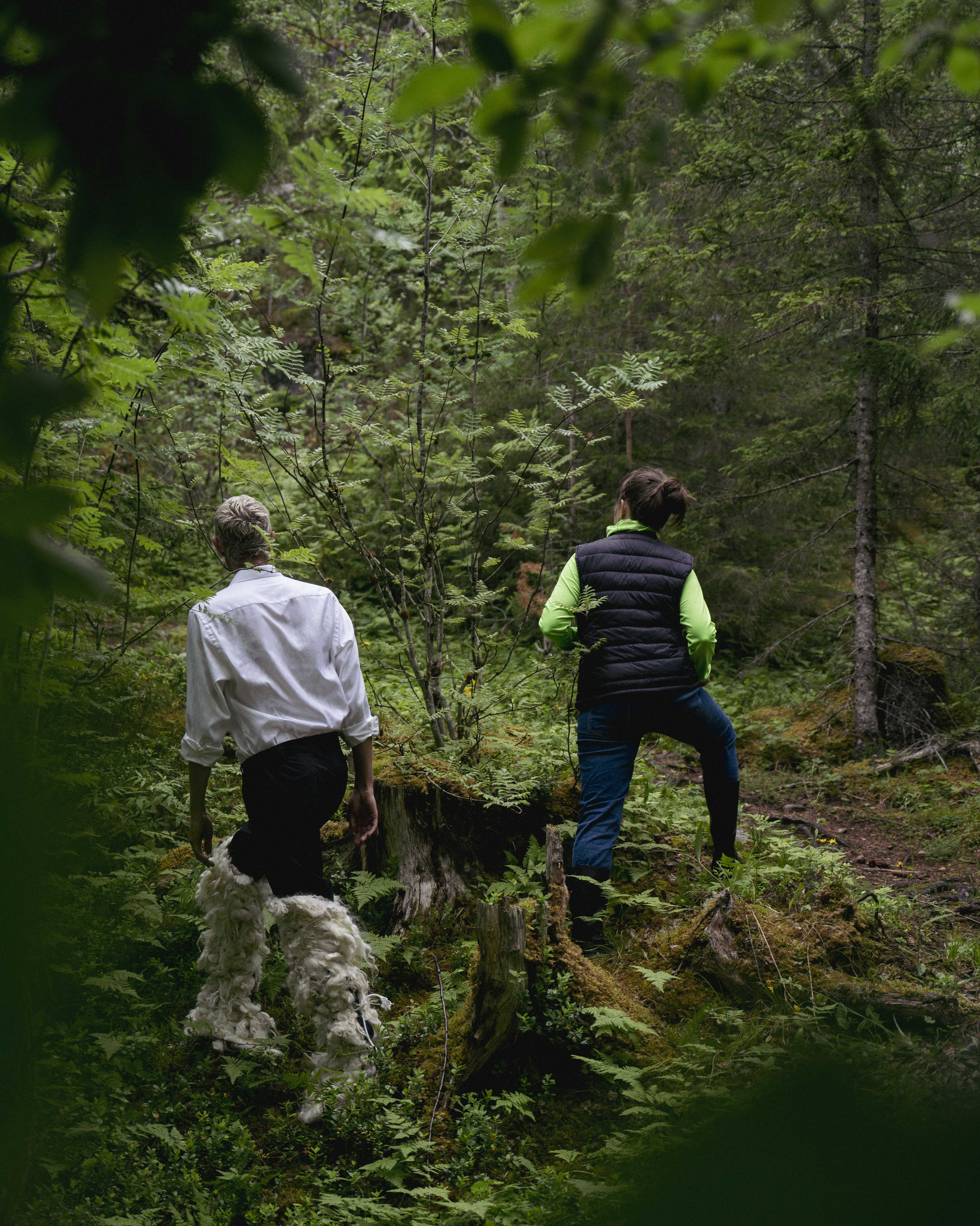 Ein liten klase av piggete røyksopp. Eit tre som omfamnar ein stein. Lyden av fottrinn i tørt gras og greiner som liknar gamle hender. Det barnlege blikket som ser noko spanande, underleg og vakkert i detaljane. Det slår meg at det er slik det er å gå tur med ungane – men at det då er dei som rettar blikket mitt mot sin måte å sjå verda på. I dette samarbeidet ser eg skogen med eit felles prosjekt i bakhovudet.
