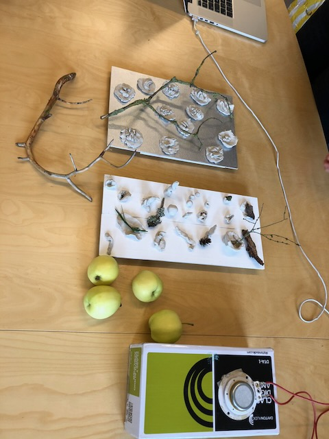 I utgangspunktet skulle me lage eit verk basert på at publikum skulle sette i gong lyden via små speledåsar som igjen skulle trigge ein anna type lyd. Det skulle vere fire speledåsar som var knytt opp mot kvar si lydfil og som styrte ein av dei fire høgtalarane. Dersom to eller fleire spela på speledåsane, ville fleire høgtalarar bli aktivert. Dette var ideen før pandemien, og me forstod etterkvart at me ikkje kunne legge opp til noko som gjorde at publikum måtte berøre noko for å aktivere lyden, eller at dei måtte stå tett for å aktivere lyden slik me ville lagt opp til. Me tok ideen om lydmaterialet og minner om fjord og hav vidare