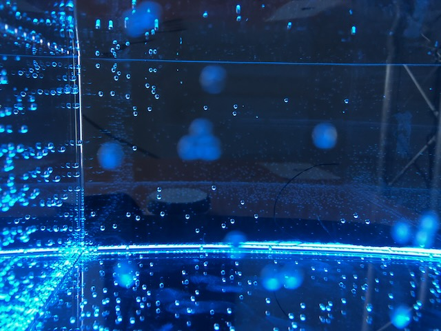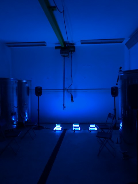 Lys og pleksiboksar med transduserar festa til sida utgjorde det visuelle aspektet. Små lommelykter lyser gjennom boksane, slik at vibrasjonane transduserane skapar forplantar seg i vatnet og skapar bølger på golv ogvegger i rommet. Det vart sendt tre ulike lydspor til dei tre transduserane, slik at dei til ei kvar tid repsonderte litt ulikt. Lyden var miksa i quad og spelt av via Reaper og 4 stk Genelec 8040. Transduserane er Visaton 60S festa til kvar av dei lysande plexiglasboksane som er fylt med vatn. Lysa under boksane er typen floalt frå IKEA. Me festa lysfilet til vindaugo og til dei flytande lysa, slik at heile rommet fekk eit blått skjær.