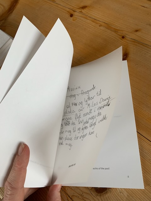 Refleksjonen er vedlagt som pdf her, samt eit lite utval bilder av den trykte refleksjonen som kan gi eit inntrykk av korleis den er. Designaren har i PDF´en prøvd å illustrere den eine transparente sida der diktet eg skreiv om Miles Davis som 13-åring er, ved å lage to sider som viser framsida og baksida av diktet.