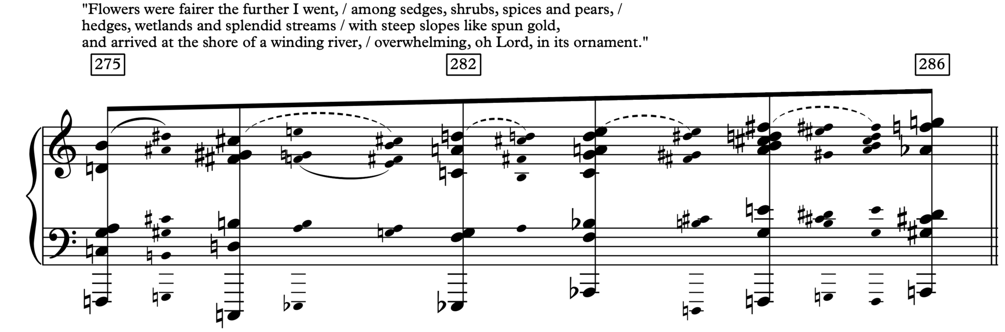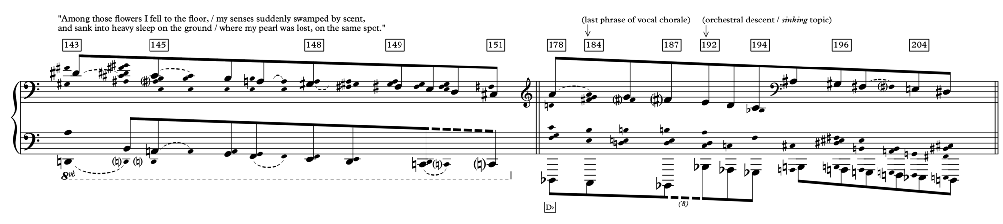 As shown in the deeper structural-level voice-leading graph (Figure 8), a large background-level ascent then begins in bar 343 (the point from which the Jeweller sees Pearl in her radiance ‘and she shone’), leading through to the gleaming, uncanny moment of her arrival (bar 427). Yet while this high-point is briefly followed by a temporary abating of tension on a local musical level, crucially, the ascent of structural upper voice soon resumes and continues to reach upward, reaching its true apex when the heavenly chorus sings of its ‘great joy’ in the aleatoric climax in bar 504. (The latter point that took me a very long time to recognize consciously; my first noted acknowledgement of this was written after the premiere; this epiphany and the difficulties its delay caused me are considered further in Part 2.)