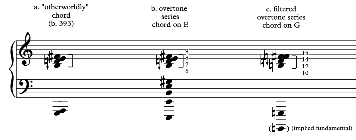 During the first phase of this ascent (bars 343–427), harmonic instability accumulates through the high degree of tension generated between the middle register and bass, which often contains adjacent seconds (‘rumbling’) that undermine the possibilities for harmonic resonance. However, because of the spacing of these verticals, a degree of resonance is arguably perceptible. For example, the ‘otherworldly’ chord shown in Figure 6a is derived from the overtones on a low E; however, with its G and A cluster in the bass, a degree of resonance is generated by its near, but not actual, alignment with the overtones on a very low G (Figure 6c). On a metaphorical-narrative level, I intended this harmonic ‘in-betweenness’ to create a sense of uncanny to mirror the strangeness of the Jeweller’s and the vision of his deceased Pearl.1