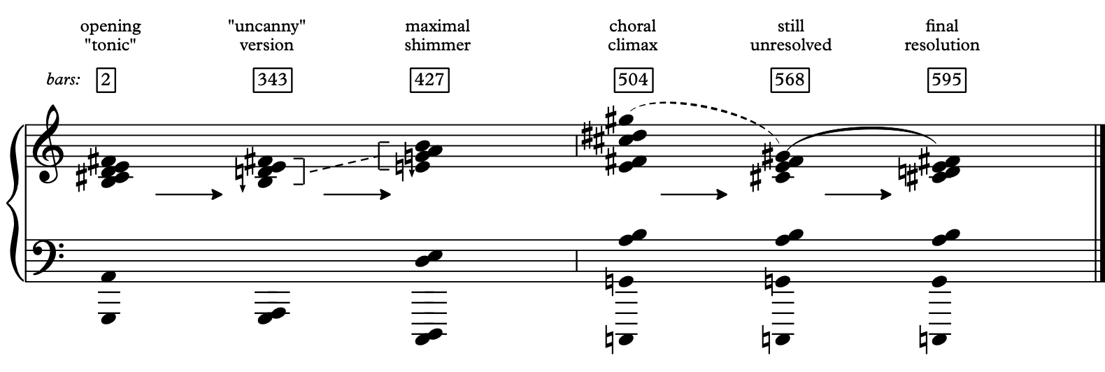 On a very simplified level, this process can be seen by charting the evolution of the ‘tonic’ chord from bar 2, into the ‘uncanny’ chord in bar 343, and its ultimate resolution, over the C-G bass twelfth, in the final section of the piece (from the climax in bars 504 onwards to the end), shown here in Figure 7.