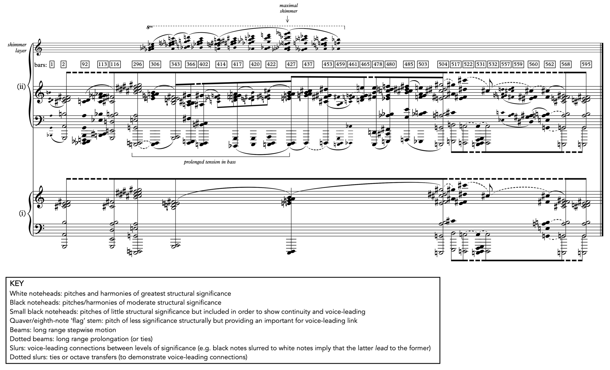 Figure 8 below thus represents a more elaborate music-graphic attempt to show the work’s long-range voice-leading processes, including the structural melodic ascent to the moment of ‘maximal shimmer’ in bar 427, and its continuation to the climax in bar 504 described above. The graph is shown in two levels of detail (i and ii) to aid reading and clarify which harmonies and pitches have the greatest structural significance for the long-term musical trajectory of the work.2 (I have included a key for those unfamiliar with these analytical methods; knowledge of Schenker/voice-leading theories is not a prerequisite for reading the graph.)